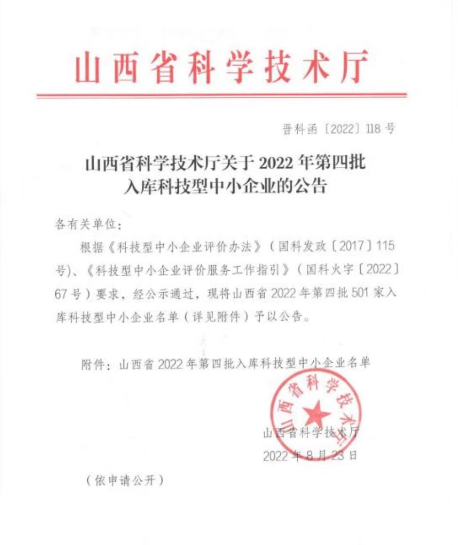 根據(jù)《科技型中小企業(yè)評(píng)價(jià)辦法》(國(guó)科發(fā)政[2017]115號(hào))、《科技型中小企業(yè)評(píng)價(jià)服務(wù)工作指引》(國(guó)科火字[2022]67號(hào))要求,經(jīng)公示通過,我公司入庫(kù)2022年第四批科技型中小企業(yè)。